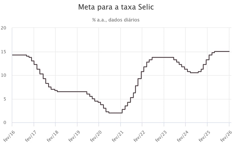 Histórico anual Taxa Selic 10 anos. Fonte: Banco Central / Estatísticas